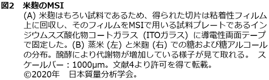 日本酒造りにおいて米麴は重要な要素の一つである。酒造りにおける米麴の役割は、主にデンプンとタンパク質の分解酵素の供給と考えられている。また、出来上がった米麴の成分は酒質 (味や香り) に大きな影響を与えることも知られている。しかし、その品質の良し悪しの判断はこれまで杜氏の経験によるところが多く、科学的な知見が十分に得られている状況にはなく、開拓の余地が残された領域であると言える。杜氏が米麴の品質を判断する際には、外観や触感という物理的な構造を指標の一つとしている。かつては、走査型電子顕微鏡を用いた米麴の内部構造に関する研究が行われていたが、近年まで米麴の構造と成分の関連性を評価する研究はほとんど進められてこなかった。ここでは、醗酵食品の一つである米麴にMSIを適用し、醗酵過程で産生される代謝物の分布変化の可視化を試みた。