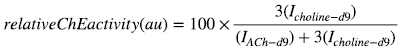 得られたコリン-d9の分布結果とアセチルコリン-d9の分布結果から、以下の式を用いて画像演算を行い最終的な相対酵素活性分布を作成した。なお、ここでIcholine-d9の前に置かれた係数はアセチルコリンとコリンのイオン化効率の比を表し、アセチルコリンはコリンよりも3倍イオン化効率が高かったことから導入した。