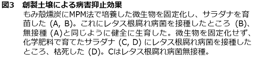 MPM法で培養した微生物を炭やバーミキュライトなどの非土壌媒体に固定化し、創製土壌とし、トマトやレタスなどを育てると、病原性フザリウムを接種しても病害が発生しない (図3)12)。創製土壌では病原性フザリウムの増殖が抑制されることが明らかとなっている (MPM法による培養液には抗菌性物質は含まれておらず、微生物が病原菌に直接作用しているものと思われる)13)。本法を用いれば、病害抑止土壌を人工創製できる可能性がある。今後、病原性フザリウム以外の病原菌についても病害抑止効果を示すか、検討を進めている。