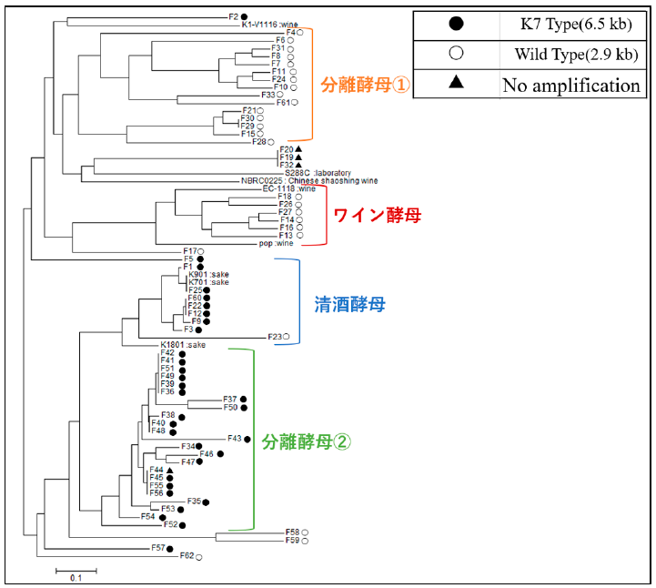 分離酵母は、分離酵母のみからなる独立した2つのクラスター (分離酵母①クラスター、分離酵母②クラスター)、清酒醸造に用いられるきょうかい酵母と分離酵母によって構成されるクラスター (清酒酵母クラスター)、醸造用ワイン酵母と分離酵母によって構成されるクラスター (ワイン酵母クラスター) の4つの主要なクラスターを形成した。