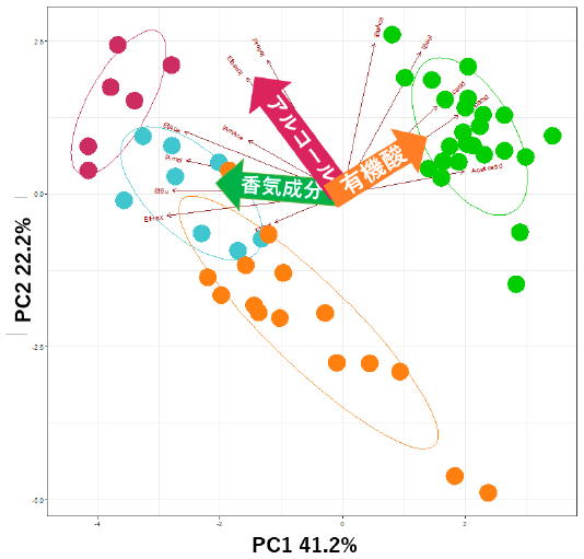 次に分離酵母間で醸造特性に差異があるのか確認するため、アルコール発酵能に加え、清酒小仕込み試験の成分分析結果 (有機酸3成分、香気成分9成分) を用いてPCA分析を行った (図2)。清酒酵母及びワイン酵母クラスターに属する酵母はPCA図の左上に位置し、高アルコール発酵、高香気成分生成 (酢酸イソアミル、イソアミルアルコール) 及び低有機酸という特徴を示した。一方で分離酵母②クラスターに属する酵母は右上に位置し、香気成分の量が少なく有機酸生産量が高い傾向が見られた。K7型の遺伝子変異を持つ分離酵母②クラスターは、胞子形成能も消失している。この形質は自然界での生存競争に勝つには不利な特徴と思われる。この弱点を補うため、自然界に進出/漏洩したK7型酵母株は自然界で生き延びるため、酢酸などの有機酸をより多く生成し、周りの環境のpHを下げる生存戦略をとっているのかもしれない。分離酵母①クラスターの酵母は中央下側に位置し、アルコール及び香気成分の生成がやや控えめである傾向を示した。また、各酵母クラスターはPCA図上でも同じようにクラスターを示した。このことから、マイクロサテライトを用いた分類と醸造特性は良い相関がある事がわかり、醸造を行う際の酵母選択の目安にすることがわかった。