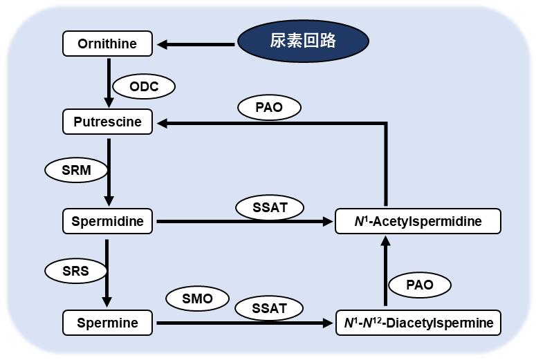 また、様々ながんで共通してポリアミン類がマーカー物質として残る。ポリアミン類は古くからがんのマーカーとして知られ、すい臓がんの組織内の含有量と、尿中のポリアミン濃度が正に相関するということが1990年代に報告されている25)。ポリアミンは、尿素回路のオルニチン脱炭酸酵素(ornithine decarboxylate; ODC)によってプトレシンに変換される。プトレシンはその後スペルミジンやスペルミンに変換される (図2)。更にこれらの物質はスペルミジン/スペルミンN1-アセチルトランスフェラーゼ(SSAT)によってアセチル化される。通常の細胞ではこれらが一定の範囲に保たれているが、がん細胞ではポリアミン類が過剰な状態となりアセチル化により不活性化し、細胞外に排出される。尿においては大腸がんや乳がんにおいてアセチル化が2段階進んだN1, N12-ジアセチルスペルミンが最も感度よく上昇することが知られている。