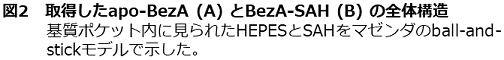 次に、X線結晶構造解析により、BezAの基質認識能や反応機構の解明を試みた。X線結晶構造解析においては、結晶化に用いたバッファー成分のHEPESが基質ポケットに入った構造 (apo-BezA, PDB ID: 7FBH) と、HEPES とS-adenosyl-L-homocysteine (SAH) の2 つの分子が基質ポケットに入った構造 (BezA-SAH, PDB ID: 7FBO) を取得することに成功した (図2A, B)。一方、基質であるGPPやメチル基ドナーであるSAMとの共結晶を取得することはできなかった。GPPとの共結晶が得られなかったのは、HEPESがGPPのポケットに強固に結合しているためであると考えられた。実際に、HEPES溶液中ではBezAのメチル化活性を見ることができなかったことからもHEPESが基質ポケットに強く結合していることが示唆された。
