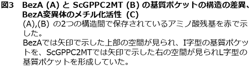 得られたBezAの全体構造に着目すると、BezAは通常のメチル基転移酵素同様、Rossmann foldをとっており、アミノ酸配列の相同性は約20%程度と低いものの構造が解明されていたScGPPC2MT (PDB ID: 3VC2) およびSlGPPC2MT (PDB ID: 4F86) とも非常に類似した構造をとっていることが明らかになった (3VC2、4F86それぞれに対して、RMSD 1.51 Å、1.15 Å)。しかし、全体構造をより詳細に見ると、BezAのαE1、αE2ヘリックスがGPPC2MTのものより長く、基質ポケットが縦に長くなっていた。また、BezAの構造間でも、BezASAHの構造において、αZ1ヘリックスがapo-BezAのものよりも長く、基質ポケットを閉じるように配置されていた (図2A, B)。さらに、このαZ1ヘリックス中の28番Tyr (Y28) と基質ポケットに存在する174番Tyr (Y174) が水素結合により相互作用することでαZ1ヘリックスが固定されていることがわかった (図3A)。実際にこれら2つのTyrのうち一方をPheに置換すると大幅に活性が減弱した (図3C)。このことから、反応時に基質ポケットを閉じるためにY28-Y174の相互作用が重要であることが明らかになった。