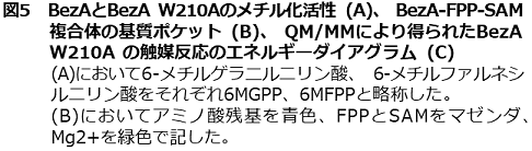 まず、BezAと基質であるGPP、補酵素であるSAMとMg2+のドッキングを行い、これらの複合体モデルを得た (図4A)。この複合体において、Mg2+はS277とN281を介してGPPの保持に関与していることが示唆され、実際に、これらのアミノ酸の置換によりメチル化活性が減弱もしくは消失していた (図3C)。次に、この複合体構造をもとに30 ns の分子動力学 (MD) シミュレーションを行ったところ、SAMのメチル基とGPPのC6位がメチル基の転移が生じうる距離に存在していた。また、ScGPPC2MTについても同様にMDシミュレーションを行ったところ、SAMのメチル基とGPPのC2位がメチル基の転移が生じうる距離に存在していた。最後に、量子力学/分子力学 (QM/MM) 計算により、反応のエネルギー計算を行った。その結果、BezAではtransition state 1 (TS1) を経由してメチル基がGPPに転移し、C7位にカルボカチオンを有するintermediateが形成されること、transition state 2 (TS2) を経由してC6位のプロトンがE170に引き抜かれ、product (6MGPP) が形成されることが明らかになった (図4B)。このとき、初期状態からTS1への活性化エネルギーは12.4 kcal/mol、intermediateからTS2へは0.2 kcal/molであった。また、F214がカルボカチオンの安定化に寄与しているかを調べるため、F214を含めないでQM/MM計算を行ったところ、intermediateからTS2に至るまでの活性化エネルギーに大きな差がなく、F214が量子的な寄与をしていない、つまり、カルボカチオンの安定化のためのカチオン-π相互作用が存在しないことが示唆された。このことより、F214は物理的にGPPを基質ポケット内で固定するために存在していると考えられた (図4B)。一方、ScGPPC2MTについてもQM/MM計算を行った結果、BezAと同様の機構で反応が進行することが明らかになった。しかしながら、ScGPPC2MTではTS1への活性化エネルギーはBezAと類似しているものの、intermediateやTS2が見られず、GPPのC2位へのメチル基の転移と同時にC2位のプロトンがE173へと転移していることが示された (図4C)。以上の解析から、BezAとGPPC2MTの反応機構の詳細を明らかにすることができた。