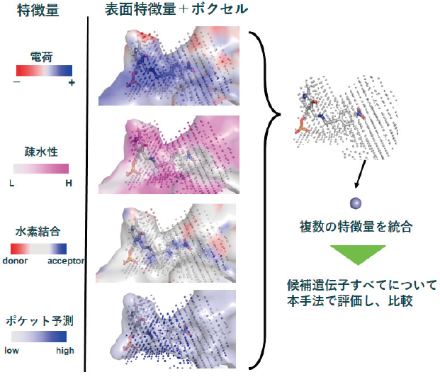 具体的には、これまでの配列ベースの探索手法に加え、近年AlphaFold2などで注目が集まっている3次元構造モデリングの手法を用いる (図4)。酵素反応の予測では、タンパク質の立体構造のうち特に活性部位の構造に注目する。活性部位のポケット構造表面を様々な特徴量を用いて定量化し、探索対象の酵素遺伝子のすべてに対してこれらの特徴量を解析し比較することで、配列情報だけでは分からない各酵素の物理化学的特徴を分類する。その後、目的の基質との反応性について、分子動力学シミュレーションを活用して絞り込む。産業ニーズが大きいトランスアミナーゼを未培養微生物遺伝子データから選抜し、bit-QEDで活性が見込まれた候補配列の活性を実験的に検証したところ、70%程度の確度で目的の活性を持つ酵素を取得できた。また、bit-QEDで得られる情報を元に、酵素配列の改変を行い、機能向上を行うことも可能である。