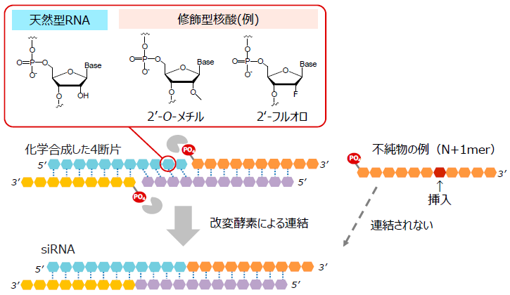 我々は、主要な核酸医薬のモダリティのうち、21-23 merのセンス鎖およびアンチセンス鎖の二本鎖からなるsiRNAの製造への酵素反応の利用を試みた (図1)2,3)。本製法は、両鎖をそれぞれ2つ以上の短鎖断片に分け、断片間の相補性を利用して二本鎖を組ませた上で酵素により連結することで、4つ以上の核酸断片からsiRNAを生成するというものである。