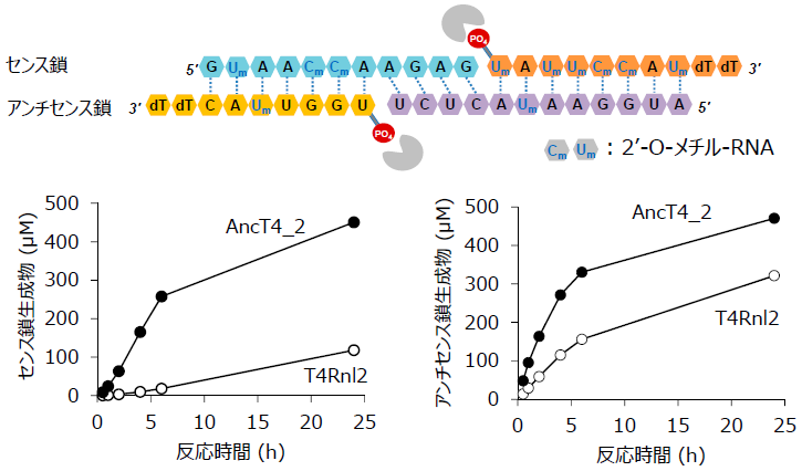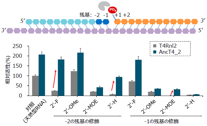 次に、AncT4_2とT4Rnl2における各種修飾型核酸に対する活性を比較した。評価方法は、二本鎖RNAのニックを連結する反応とし (図3)、連結部の両側2残基をそれぞれ修飾型核酸に置き換えた基質を用いた。T4Rnl2の活性は、3’側の残基 (図3の+1および+2の残基) の置換による影響はなかった一方で、5’側の残基 (図3の-1および-2の残基) を修飾型に置換した場合に低下が認められた。これに対し、AncT4_2では、これらの修飾型核酸を導入したRNAに対しても、一部で高い連結活性を示した。例として、連結部から2残基目 (図3の-2の残基) が2’-フルオロ基で修飾されたRNAに対する活性が7倍に向上していた。以上のように、AncT4_2は、T4Rnl2の基本的な能力を維持しつつ、基質特異性が拡大していることが分かった。