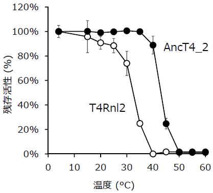 また、祖先型設計により酵素の熱安定性が向上する例も多く報告されている。調製した酵素を各温度で1時間加熱後に残存活性を測定したところ、残存活性が50%になる温度は、T4Rnl2の32℃に対して、AncT4_2は45℃に向上していた (図4)。このような酵素の熱安定性の向上は、工業化時の安定生産や長時間の反応に有用な性質である。また、より高温で反応することで、反応速度の向上も期待される。