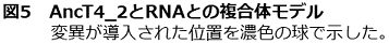 AncT4_2とRNAの複合体モデルから、高機能化の機構を考察した (図5)。AncT4_2に導入された22箇所の変異点のほとんどは、基質であるRNAの結合部位の裏側に位置していた。基質結合部位から離れた位置へ多数の変異が導入されることで、基質結合部位付近の構造が変化し、基質特異性の拡大につながった可能性がある。このうち4変異点はグリシンへの置換、2変異点はアミノ酸残基の欠失であった。先行研究では、グリシンへの置換やアミノ酸残基の挿入・欠失により、タンパク質のフレキシビリティの向上や11)、運動性に影響することが報告されており12)、AncT4_2でも同様の機構で性質が変化した可能性がある。基質から離れた位置における有効変異の予測は、立体構造に基づく合理的な改変では難しいことも多く、祖先型設計法の有用性を示す結果となった。