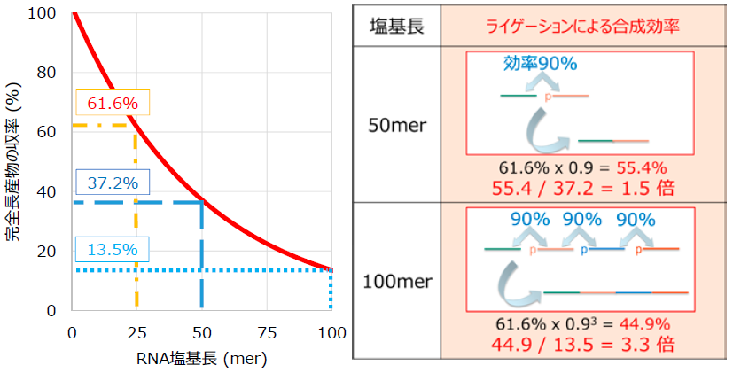 これらの問題を解決して、修飾等のバリエーションに富んだ長鎖RNAを高効率に生産するためには、比較的化学合成が容易である短い鎖長のRNAを複数作製し、リガーゼ等の酵素で連結 (ライゲーション) することが有用であると我々は考え、製法の開発に取り組んできた。例えば完全長産物量61.6%の効率で合成できる25 merの複数RNA断片をライゲーションした場合、その反応点でのライゲーション効率が90%であれば、50 mer合成では55.4% (61.6% × 0.9 = 0.554)、100 mer合成では44.9% (61.6% × 0.93 = 0.449) となり、連続的に化学合成した場合と比較してそれぞれ1.5倍、3.3倍の効率上昇となる (図7)。RNA化学合成とライゲーション反応を組み合わせることによって、計算上顕著な高効率化が可能であり、さらに高効率化だけではなく、多数のRNAをライゲーションさせることによって、今までは合成が著しく困難であった150 mer以上の部分修飾RNAの合成も可能になる。