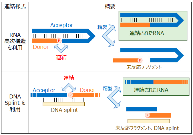 RNAのライゲーションに用いる酵素としては、siRNA製法の検討時と同様に二本鎖RNAリガーゼを主に使用している。二本鎖RNAリガーゼは二本鎖のオリゴ核酸に対して活性を持つことから、二本鎖RNAリガーゼにより一本鎖RNAを生成するためには、連結部において二本鎖の構造をとる必要がある。そこで、ライゲーション反応において、ヘアピン構造等RNAの高次構造を利用する方法と、相補鎖DNA splintを利用して疑似的に二本鎖RNAニック様構造を形成させる方法を検討している (図8)。いずれの方法でもライゲーション後、未反応断片及びDNA Splintを液体クロマトグラフィーにより分離することにより目的のRNAを得る。AncT4_2を利用することによって、修飾核酸を含んだRNAにおけるライゲーションの高効率化も可能である。