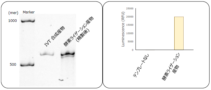 もう一つは、20以上の短鎖RNA断片を連結させ、長鎖を作製したものである。図8下段の様式を応用して、トゲオキヒオドシエビ[Oplophorus gracilirostris]由来ルシフェラーゼ (NanoLuc®) をコードした全長500 merを超えるmRNAの合成に挑戦した (図9、左)。この合成したmRNAを用いて無細胞翻訳系でタンパク質を合成し、ルシフェラーゼ活性を確認することに成功した (図9、右)16,17)。