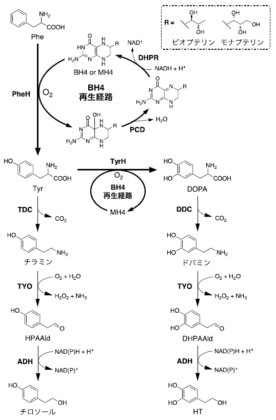 テトラヒドロビオプテリン (BH4) 依存性の芳香族アミノ酸水酸化酵素はヒトをはじめ動物に特異的な酵素で、生命維持に重要な役割をもつ。フェニルアラニン (Phe) 水酸化酵素 (PheH) は食事で摂取した過剰なPheの代謝、チロシン (Tyr) 水酸化酵素 (TyrH) およびトリプトファン水酸化酵素は神経伝達物質 (ドパミン、アドレナリン、セロトニン、メラトニンなど) の生合成に関わる (図1)1)。これらの欠損はフェニルケトン尿症や神経疾患の原因となるため、医学分野で現在も研究されている。他方、温和な条件下、ワンステップで芳香環を位置選択的に水酸化する本酵素は、産業分野からも興味がもたれた。しかし1980年代に遺伝子が発見されたにも関わらず、応用研究の報告はなかった。このような背景から、筆者らは本酵素の微生物による有用物質生産への応用は、生産可能な化学種を拡大する上で重要と考え研究を進めている。