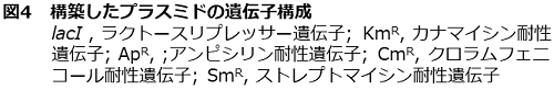 本プラットフォームの有用性をDOPA生産で評価した9)。2節で使用したマウス由来TyrH遺伝子とBH4再生関連遺伝子をオペロンとして発現するプラスミドpBbE1k-3 (図4) を導入した結果、1.0 g/L (5.3 mM) のDOPA生産が確認された。このように、プラスミドフリーなプラットフォームでも、1 g/LのTyr誘導体生産が可能であることがわかった。また、Tyrの蓄積が認められたことから、DOPA合成反応が律速ステップであった。