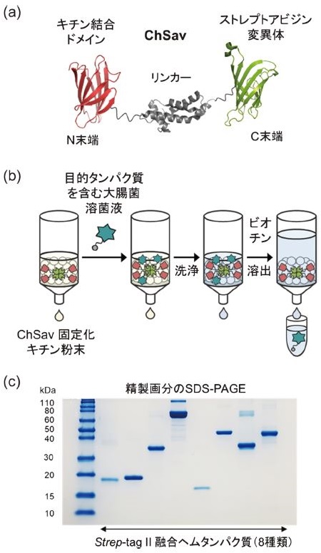 そこで筆者らは、クロマトグラフィー用担体としてキチン粉末の利用に着目した。安価な多糖高分子であるキチン粉末は、主にカニやエビなどの水産物から加工廃棄物として得られ、非可食性バイオマスとして現在さまざまな活用法の検討がなされている。本研究では、このキチン粉末をStrep-tag II のクロマトグラフィー用担体として利用するべく、Strep-tag II 結合能を有するストレプトアビジン変異体と、Thermococcus kodakarensis KOD1由来キチナーゼのキチン結合ドメイン3)を連結した融合タンパク質ChSavを調製した (図1a)。ChSavの発現には、Brevibacillus choshinensis HPD31-SP3を用いた分泌発現システムを採用し、キチン粉末を担持したカラムに対して、ChSavを含むBrevibacillus choshinensis HPD31-SP3の培養液の上澄みを流通させることで、ChSavのカラムへの固定化を行った。続いて、目的のStrep-tag II 融合タンパク質を含む大腸菌溶菌液を、このChSavを固定化したキチン粉末へと添加し、カラムの洗浄操作後、ビオチン溶液によりStrep-tag II を選択的に解離・溶出させることで、目的タンパク質のアフィニティー精製を行った (図1b)。例として、図1cにStrep-tag II を融合したヘムタンパク質 (計8種類) の精製画分のSDS-PAGEを示す (左から順にmyoglobin、nitrobindin、dye-decolorizing peroxidase、catalase、truncated hemoglobin、flavohemoglobin、tryptophan 2,3-dioxygenase、cytochrome P450)。目的タンパク質の分子量や高次構造、Strep-tag II の付加位置 (N末端・C末端) に影響されることなく、目的のStrep-tag II 融合タンパク質のみが単一のバンドとして高純度で得られていることが明らかとなった。これらの結果を受け、筆者らはこの精製手法を「Chitin-and Streptavidin-mediated Affinity Purification (CSAP) system」と名付け、さらなる精製条件・実験操作の検討を行った。