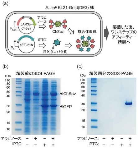 この仮説のもと、筆者らはアラビノースプロモーターPBAD支配下にChSav遺伝子をコードするpACYC系プラスミド (pAR3b-ChSav) を調製し、pETシステムとの併用によるChSavとStrep-tag II 融合タンパク質の共発現を実施した。一例として、ChSavとStrep-tag II 融合緑色蛍光タンパク質 (GFP) を共発現させたEscherichia coli BL21-Gold(DE3)株のSDS-PAGEを図2bに示す。アラビノースとIPTGの二つの誘導剤を用いた直交型の遺伝子発現制御により、当初の設計通りの両タンパク質の共発現が実現していることが判明した。さらに、このChSavとGFPを共発現させた大腸菌溶菌液を、キチン粉末を担持したカラムへ添加し、上記と同様にカラムの洗浄操作後、ビオチン溶液を用いて溶出させることで、Strep-tag II 融合タンパク質の一段階のアフィニティー精製に成功した。図2cの精製画分のSDS-PAGEに示す通り、アラビノースとIPTGの両誘導剤の添加によりChSavとGFPの共発現を行った場合にのみ、高純度のGFPが得られている。また、GFPだけでなく、それ以外の様々なStrep-tag II 融合タンパク質についても、この大腸菌共発現系を用いたワンステップCSAP systemが機能することを実証している1)。