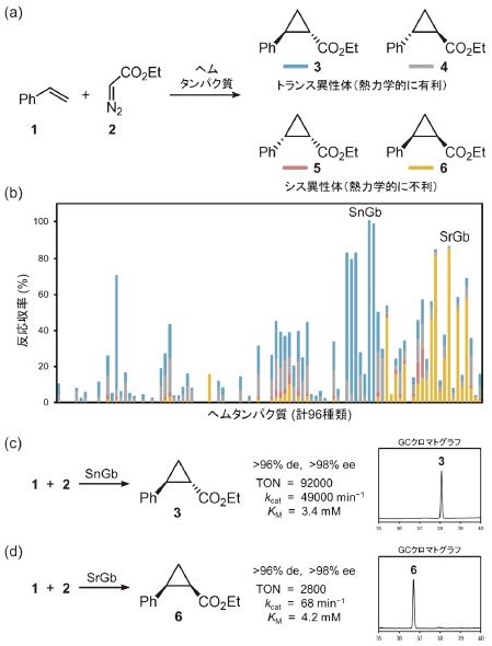 まず初めに、種々の微生物ゲノムから96種類のヘム酵素遺伝子 (cytochrome P450、dye-decolorizing peroxidase、catalase、tryptophan 2,3-dioxygenase 等) をクローニングし、Strep-tag IIを末端に付加した組換え酵素の遺伝子ライブラリを構築した。そして、この遺伝子ライブラリをE. coli BL21-Gold(DE3)株を用いて発現した後、CSAP systemによるタンパク質精製を96-well形式で実施し、精製条件下でのシクロプロパン化反応に対する触媒活性および立体選択性の評価を実施した (図3bに各シクロプロパン立体異性体3–6の反応収率を図3aに対応する色別に示す)。その結果、目的のシクロプロパン化反応に対して有望な触媒活性を示すいくつかのヘム酵素の同定に成功した。中でも、グロビンフォールドを有する比較的小さなヘムタンパク質 (以降、グロビン) は、他のヘムタンパク質と比較して特に高い触媒活性と優れた立体選択性を示すことが判明した。例えば、硫黄酸化細菌Starkeya novella由来グロビン (SnGb) は、非常に高い触媒活性 (kcat=4.9×104 min-1, KM=3.4 mM, 触媒回転数TON=9.2×104) を示し、目的生成物のうちトランス異性体3を立体選択的 (>96% de, >98% ee) に与えた (図3c)。その一方で、放線菌Streptosporangium roseum由来のグロビン (SrGb) は、熱力学的に不利なシス異性体6を立体選択的 (>96% de, >98% ee) に生成することが明らかとなった (図3d)。通常、遷移金属触媒を用いたシクロプロパン化反応では、熱力学的に有利なトランス異性体の生成が優先するため、シス異性体を立体選択的に与えたSrGbの触媒特性は、有機化学的な視点から見ても大変興味深い。また最近では、データベース上の類似配列を有するグロビンのクラスタリング解析を実施し、微生物由来グロビンの系統的なスクリーニングを実施することで、シクロプロパン生成物のうちこれまで未獲得であったトランス異性体4とシス異性体5を立体選択的に与える酵素をそれぞれ同定することにも成功している。このように、本研究で開発したCSAP systemは、精製条件下での酵素探索を指向した96-well形式のHTSへと応用可能であることが実証された。