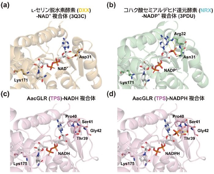 AacGLRとGoxGLRは、NAD/NADPの識別に用いられる従来のDXX/NRXモチーフの代わりに、それぞれTPSモチーフとAPSモチーフというユニークなアミノ酸配列を持つ (図2)。したがって、この特徴的な配列モチーフがNADとNADPの両方を利用するために必要なのではないか?と考え、その構造基盤を明らかにすることを試みた9)。