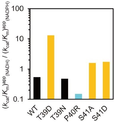 S41AおよびS41D変異体では、NADHに対するみかけのkcat/Km値とNADPHに対するみかけのkcat/Km値の比がそれぞれ1.6および1.7であり、野生型の値である0.54より高く、NADHをより好むように変化したことを示した (図4)。これらの結果は、Ser41とNADPHの2'-リン酸基との間の水素結合がNADPHの適切な収容に寄与している可能性を示唆した。一方、T39NとP40R変異体では、NADHに対するみかけのkcat/Km値とNADPHに対するみかけのkcat/Km値の比がそれぞれ0.48および0.15であり、NADHよりもNADPHに対して高い特異性を示した (図4)。これは、野生型の値よりも1.1倍および3.6倍高い値であり、特にP40R変異体においてArgによって正電荷が導入されたことで、NADPHに対する特異性が高まったと考えられる。しかしながら、これらの変異の効果は限定的であり、他のβ-HAD酵素に見られるほど特異性を上げるには至らなかった。